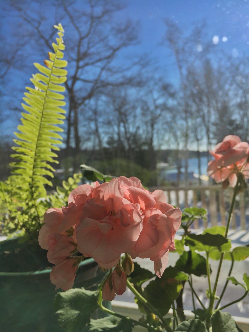 Up here in Maine, the winter sun shines low on the horizon. On clear days, the brilliant sunshine streams directly into my south-facing picture windows from early in the morning through the mid-afternoon. The miracle of sparkling white winter sunshine warms both my heart and home. In fact, my recently repotted garden geraniums are thriving in their new home on the warmer side of my plate glass dining room window. They are shouting their glad thanksgivings daily with bright new salmon-pink bunches of blossoms. I wonder if those transplanted geraniums deeply know they would not be thriving right now had they stayed in their summer window boxes now located on the frigid outer side of the same glass. Indeed for now they are blooming where they are planted, as am I. I enjoy sitting in the sunshine with these geraniums, whether we’re outdoors in the summer or indoors in the winter.