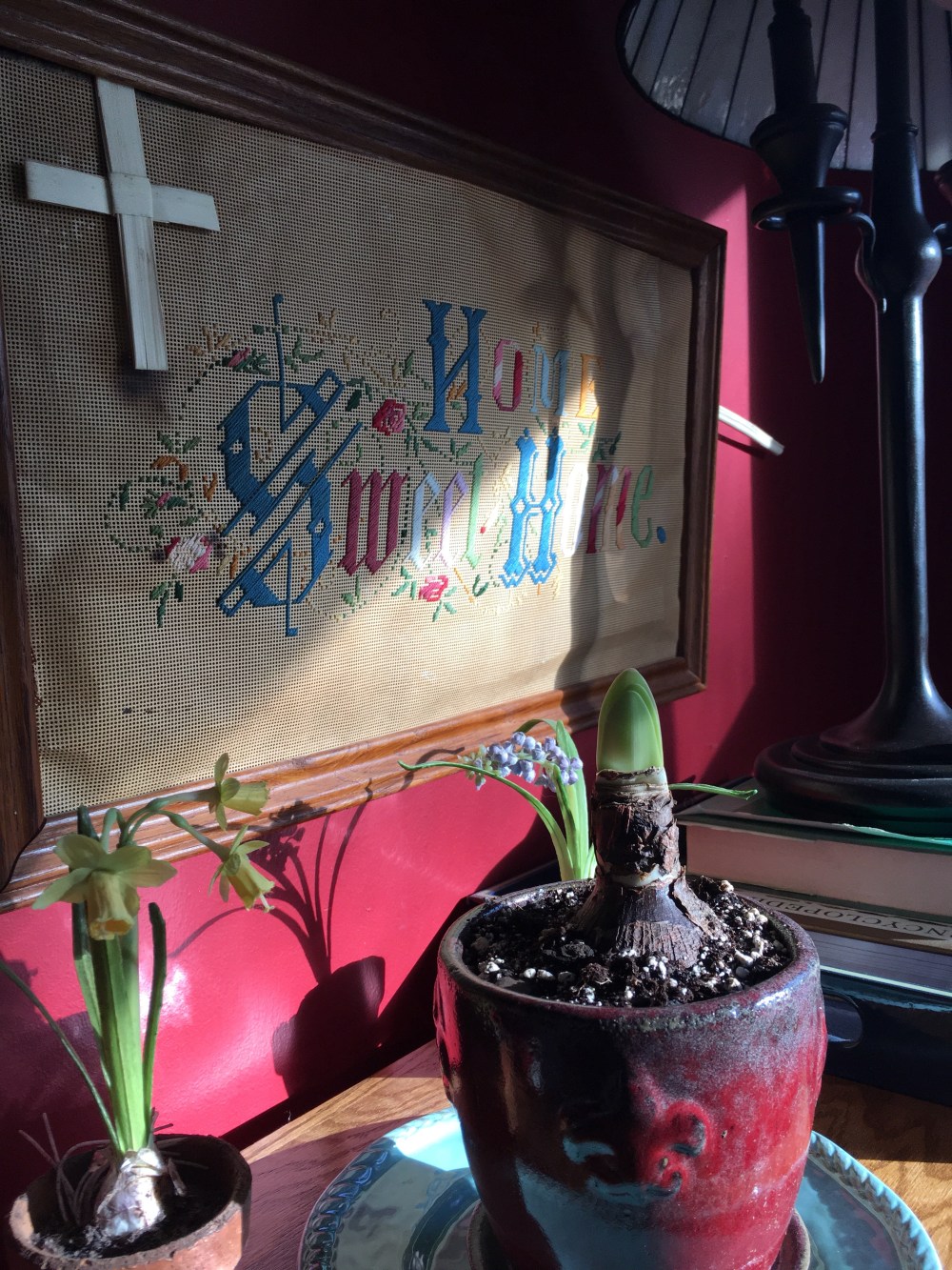 As I give my full attention to this unassuming bulb in transition, my gaze slowly refocuses on the message hanging on the wall behind it: HomeSweetHome. An epiphany dawns on me, suspended yet suddenly so obvious–all that is alive is now and always will be, changing. A vivid memory catches my breath. I’m in the summer of 1981 again, satin-stitching my heart’s deepest desire for HomeSweetHome on to this same punched paper. Though it was once stitched on new white paper, now it’s weathered into a wrinkled and stained icon of a lifelong quest of mine. How odd it is for me to witness this fragile paper slowly fading over the years.