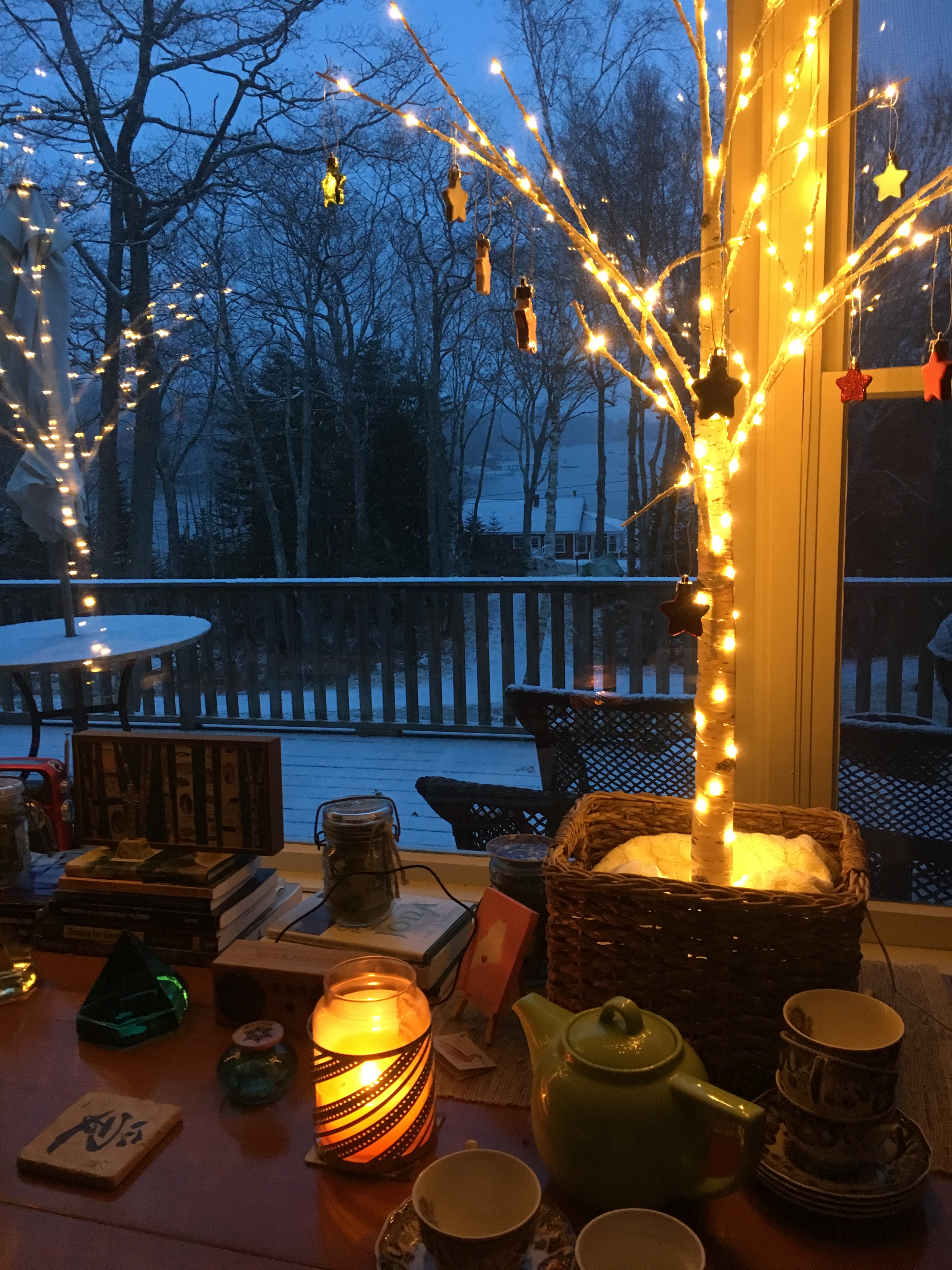 This morning we awoke to snow flurries and cloudy skies. The temperature is 34 degrees Fahrenheit at 7:00 a.m., so we don’t expect much snow accumulation for the Midcoast of Maine. In early winter, the warmer ocean temps can affect our air temps along the coast and often inhibit snow from accumulating until we get a bit deeper into winter. It’s the same concept as to why our summers are so cool, in reverse. Our summer air is cooled by the cooler ocean temps.